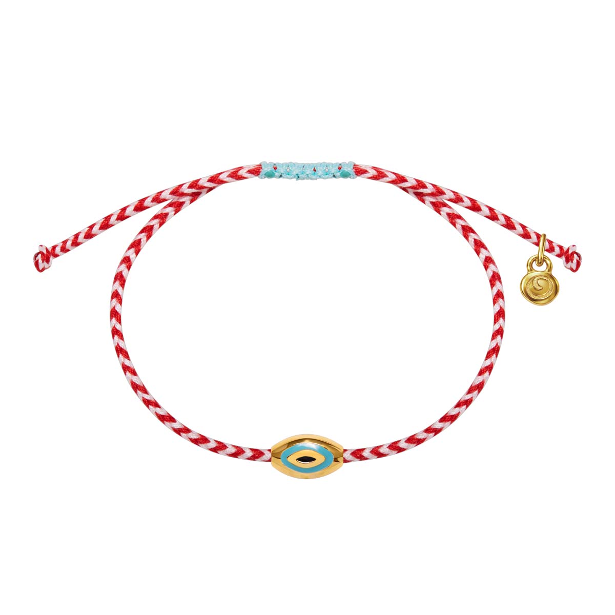 βραχιόλι επίχρυσο από ορείχαλκο Μάρτης 2πλής όψης με σμάλτο, από την μια μάτι με τυρκουάζ σμάλτο και από την άλλη ήλιος με ιβουάρ σμάλτο, κορδόνι μάρτης, κούμπωμα μακραμέ αυξομειώμενο