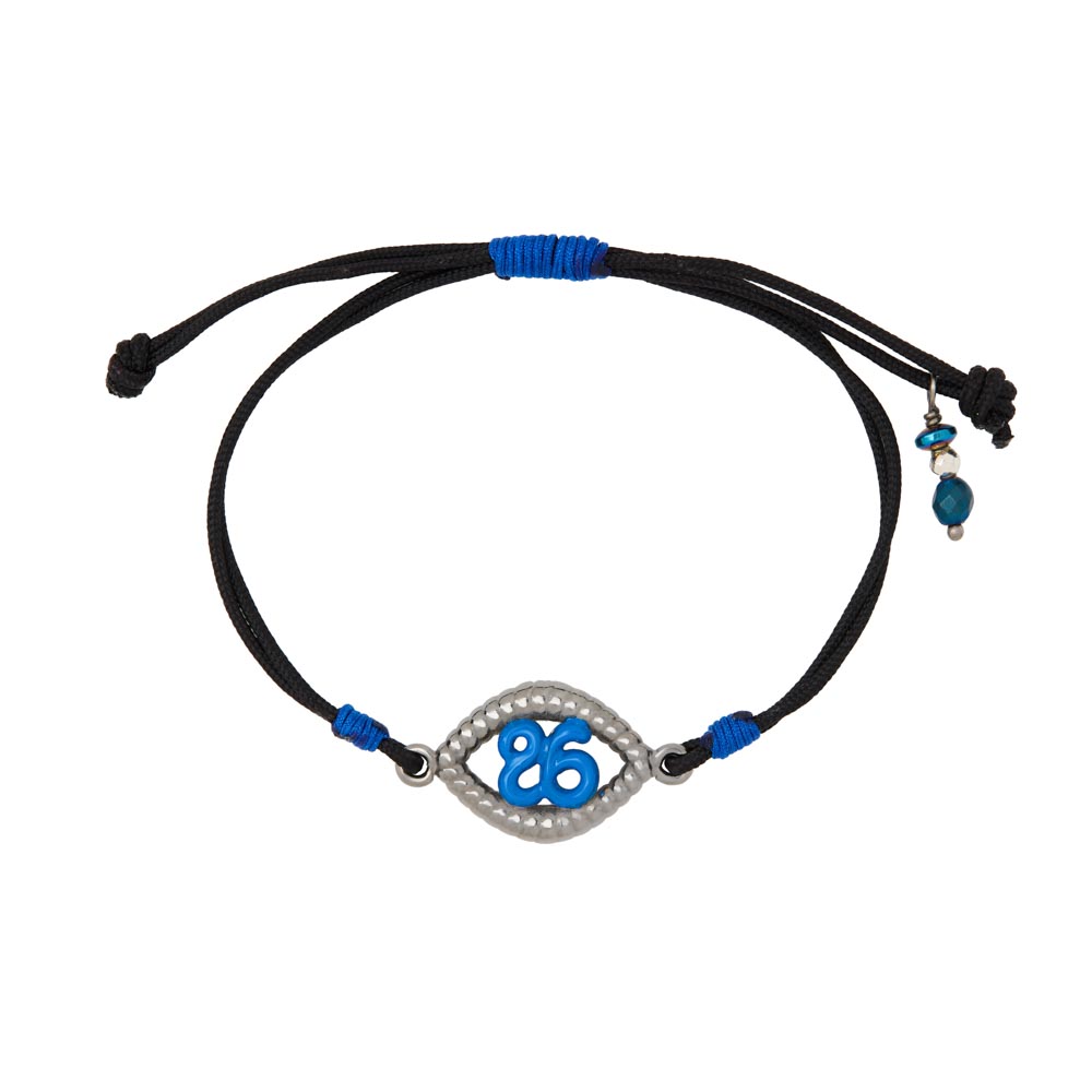 βραχιόλι από ασήμι 925 γούρι 2026 μάτι μαύρο πλατίνωμα με μπλε σμάλτο, μαύρο κορδόνι, διακοσμητικές ημιπολύτιμες πέτρες, κούμπωμα μακραμέ αυξομειώμενο