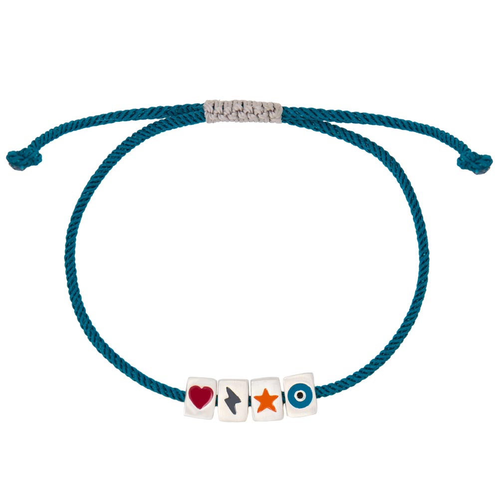 βραχιόλι από ορείχαλκο γούρι 2026, επάργυρο, κύβοι με σύμβολα, σμάλτο, στην μια πλευρά γραφει 2026 και στην άλλη είναι μάτι, αστέρι, κεραυνός, καρδιά, κορδόνι πετρόλ, κούμπωμα μακραμέ αυξομειώμενο