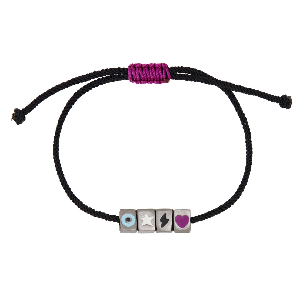 βραχιόλι από ορείχαλκο γούρι 2026, μαύρο πλατίνωμα, κύβοι με σύμβολα, σμάλτο, στην μια πλευρά γραφει 2026 και στην άλλη είναι μάτι, αστέρι, κεραυνός, καρδιά, κορδόνι μαύρο, κούμπωμα μακραμέ αυξομειώμενο